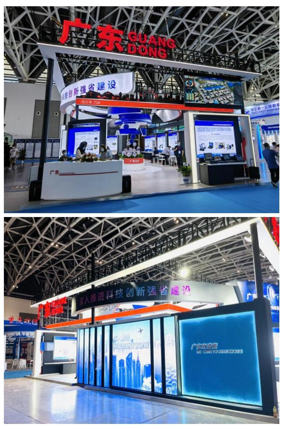 頂美公司團隊負責本次設計制作搭建工作。在對廣東科技展團展位設計上,充分考慮廣東嶺南區(qū)域特色和科技創(chuàng)新大省的風范,進行精心設計打造,實現(xiàn)了時尚設計與綠色低碳的有機統(tǒng)一,整體設計以黑、紅、藍為視覺主色調,匯聚各單位標志組成廣東形象區(qū),并使用可循環(huán)利用的金屬環(huán)保建材,在注重簡約現(xiàn)代的設計感同時兼顧節(jié)能環(huán)保的內核,充分展現(xiàn)了廣東科技展團凝聚力和粵科技“硬核”力量。